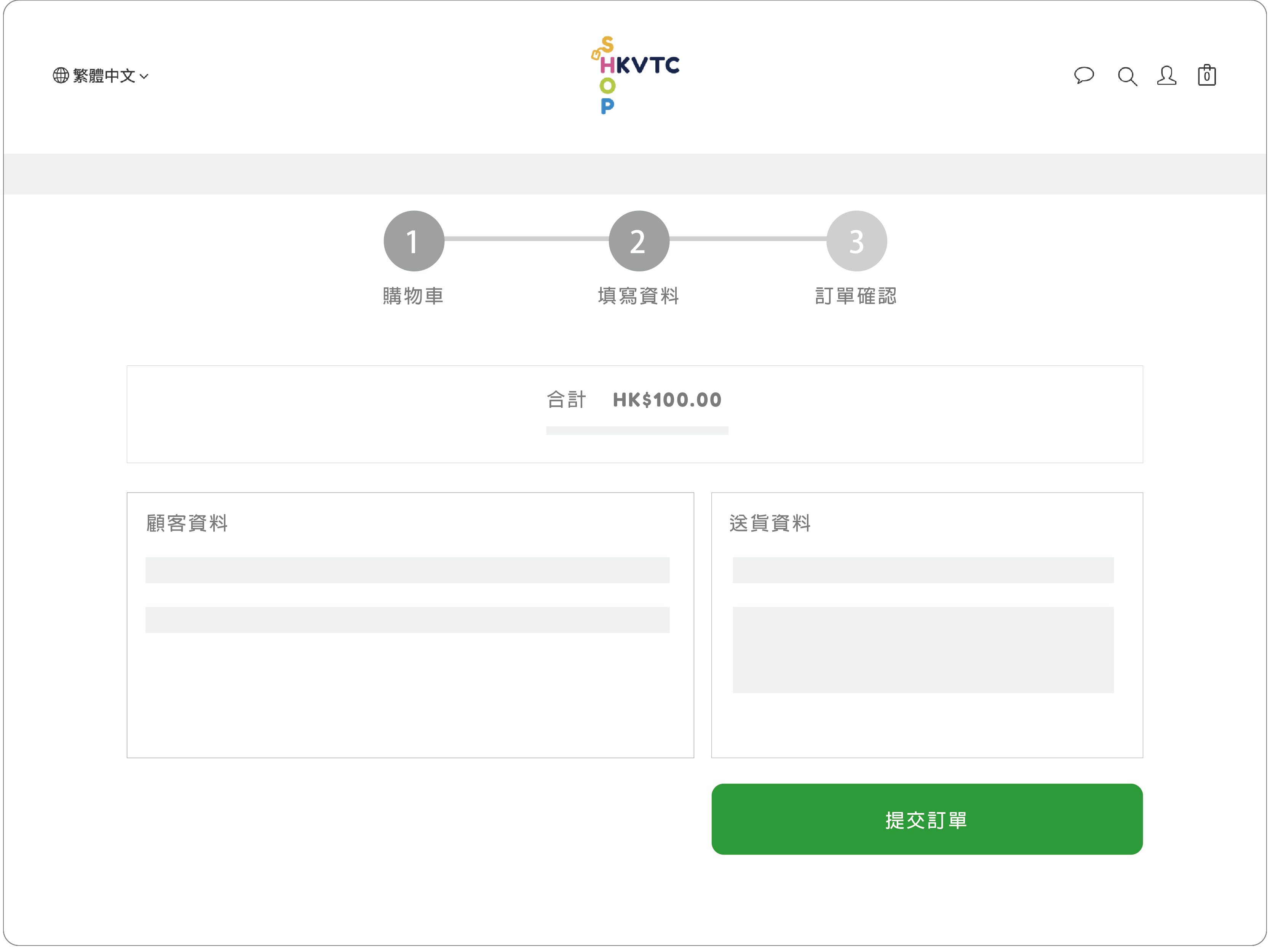 填寫正確而詳細的顧客及送貨資料(包括收件人名稱,電話號碼和地址),確認無誤後請點選「提交訂單」。
